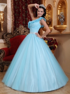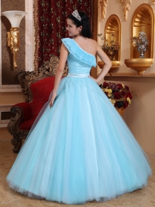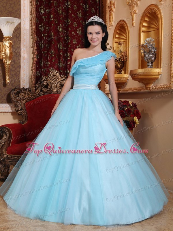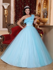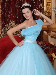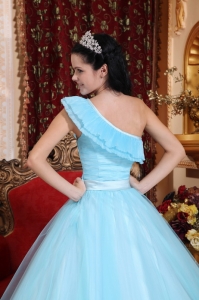 Light Blue Quinceanera Dress One Shoulder Tulle Ruch