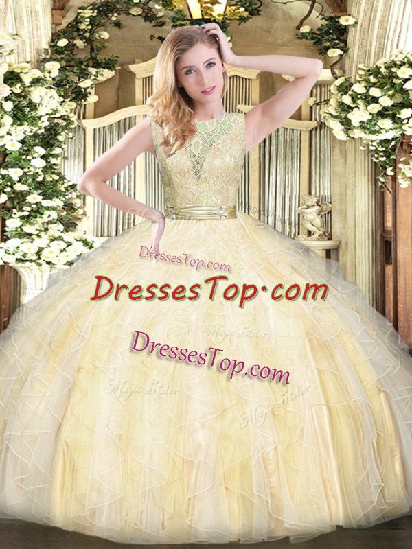 Light Yellow Organza Backless Scoop Sleeveless Floor Length Quinceanera Dresses Lace and Ruffles