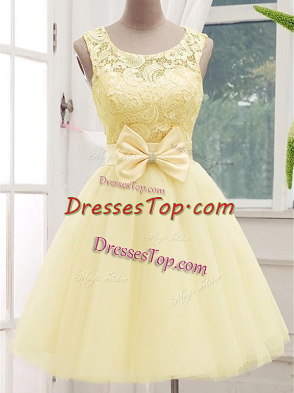 Light Yellow Tulle Lace Up Quinceanera Court Dresses Sleeveless Knee Length Lace and Bowknot