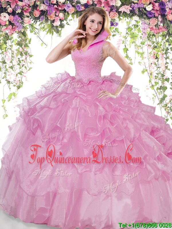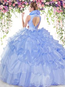 Lilac Backless High-neck Beading and Ruffled Layers Vestidos de Quinceanera Organza Sleeveless