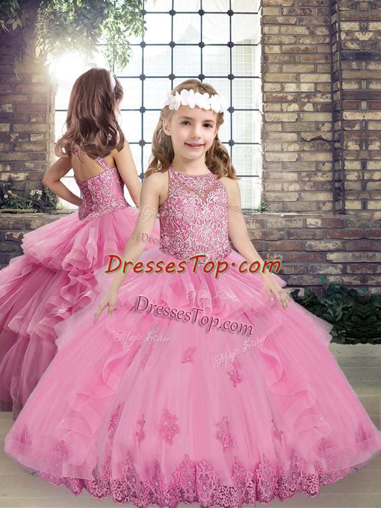 Lilac Ball Gowns Tulle Scoop Sleeveless Beading and Appliques Floor Length Lace Up Little Girls Pageant Dress Wholesale