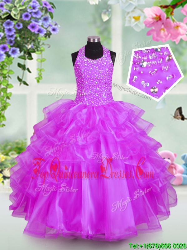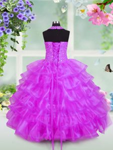 Lilac Halter Top Lace Up Beading and Ruffled Layers Little Girls Pageant Gowns Sleeveless