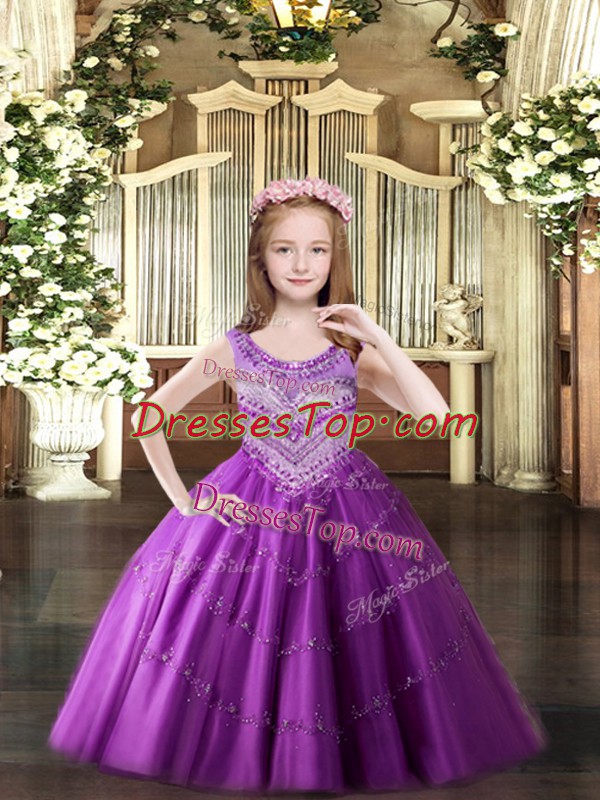 Lilac Lace Up Girls Pageant Dresses Beading Sleeveless Floor Length