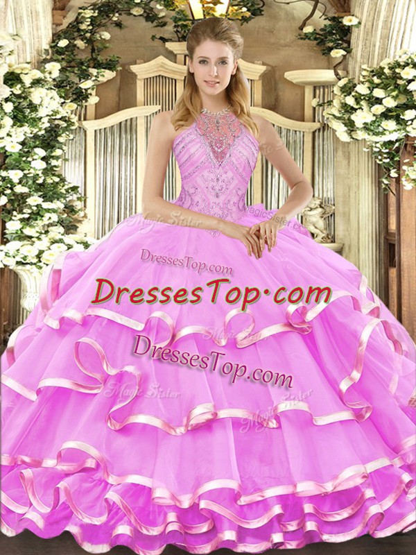 Lilac Lace Up Halter Top Beading and Ruffled Layers Quinceanera Dresses Organza Sleeveless