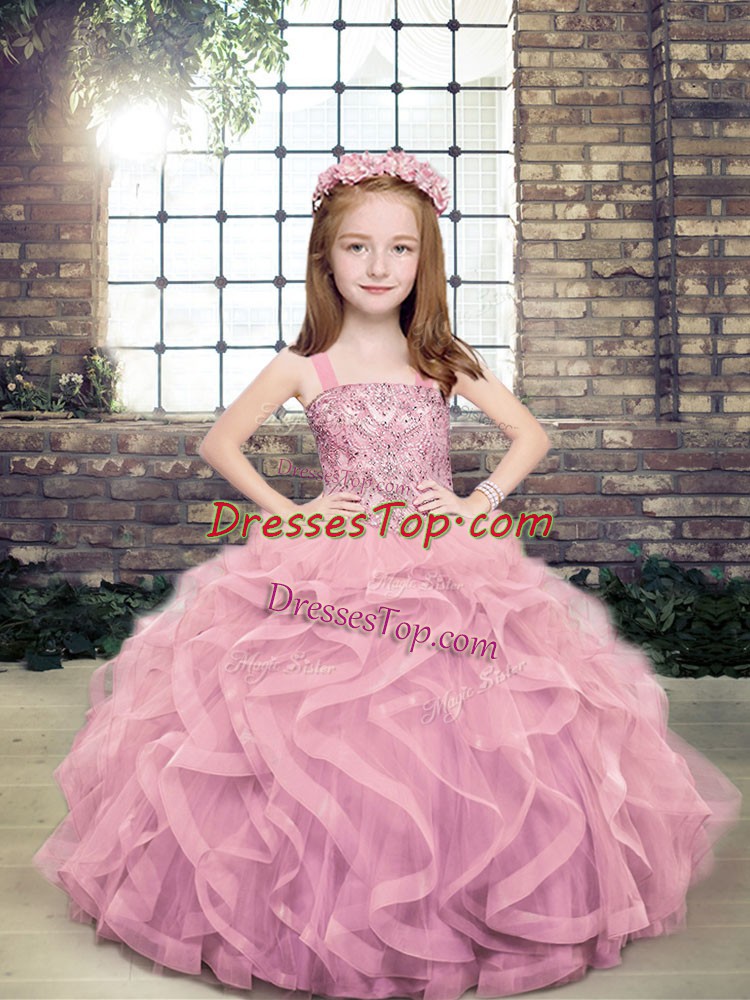 Lilac Lace Up Straps Beading and Ruffles Little Girl Pageant Gowns Tulle Sleeveless