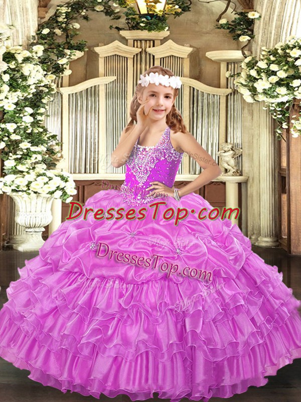 Lilac Little Girls Pageant Dress Wholesale Party and Quinceanera with Beading and Ruffled Layers and Pick Ups V-neck Sleeveless Lace Up