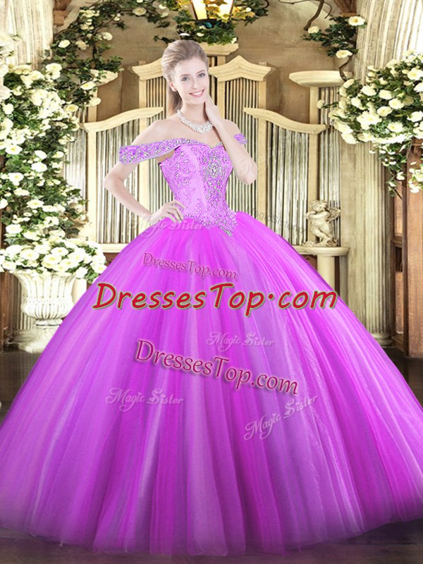Lilac Off The Shoulder Neckline Beading Quince Ball Gowns Sleeveless Lace Up
