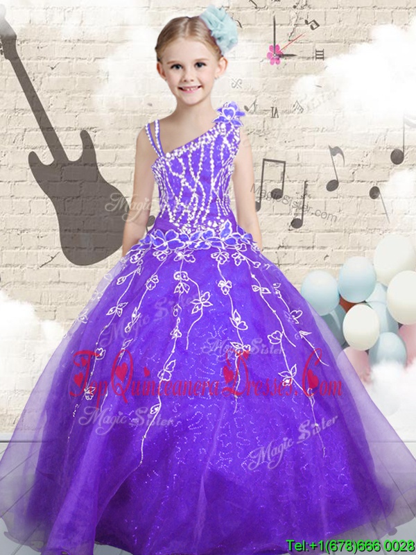 Lilac Organza Lace Up Child Pageant Dress Sleeveless Floor Length Beading and Appliques and Hand Made Flower