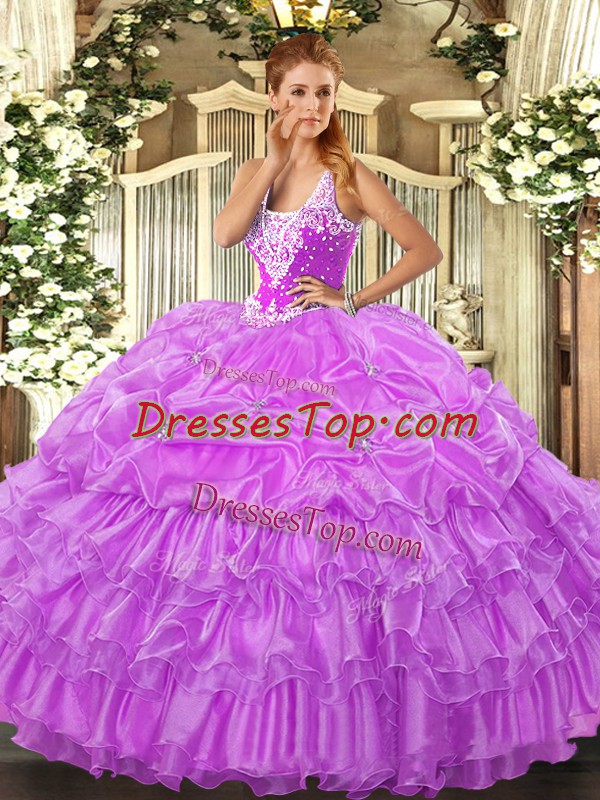 Lilac Organza Lace Up Straps Sleeveless Floor Length Vestidos de Quinceanera Beading and Ruffled Layers and Pick Ups