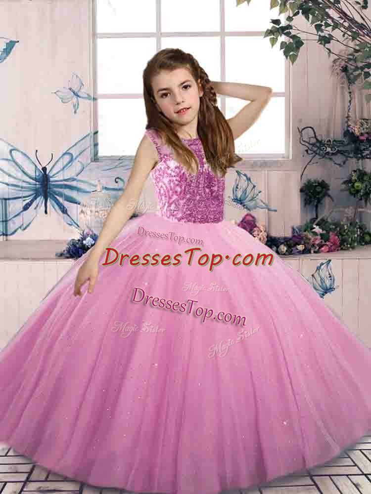 Lilac Sleeveless Floor Length Beading Lace Up Child Pageant Dress