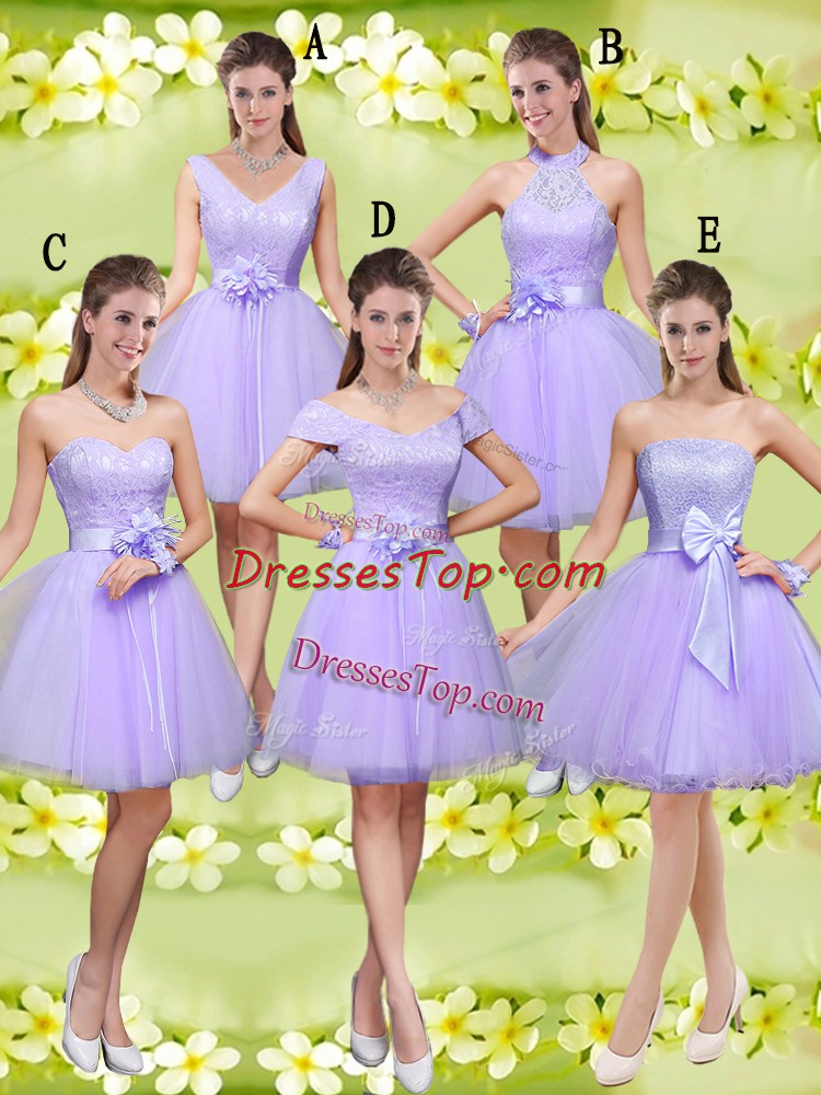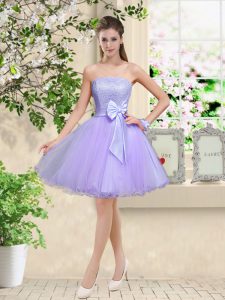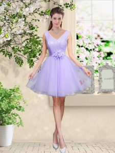 Lilac Sleeveless Knee Length Lace and Belt Lace Up Court Dresses for Sweet 16