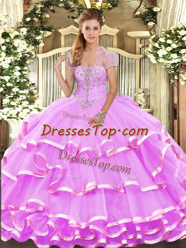 Lilac Strapless Neckline Appliques and Ruffled Layers Quince Ball Gowns Sleeveless Lace Up