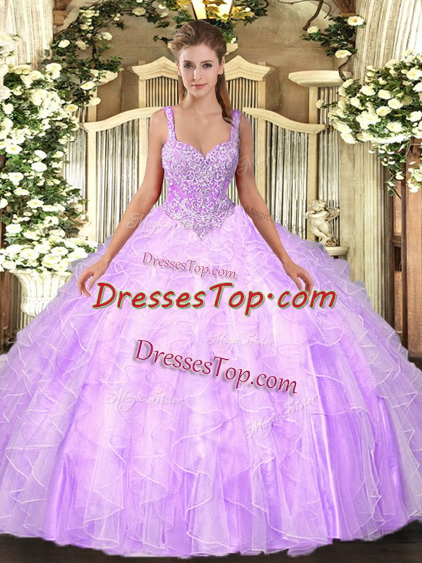 Lilac Straps Neckline Beading and Ruffles Ball Gown Prom Dress Sleeveless Lace Up