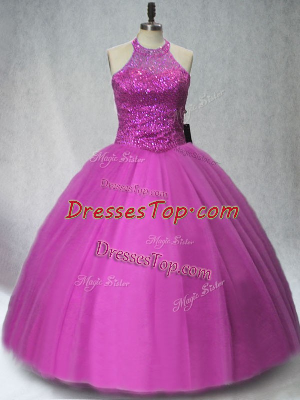 Lilac Tulle Lace Up Sweet 16 Quinceanera Dress Sleeveless Floor Length Beading