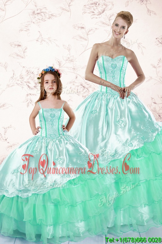 Long Sleeves Floor Length Embroidery and Ruffled Layers Lace Up Quinceanera Gown with Apple Green