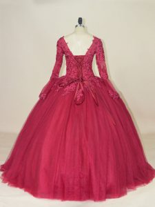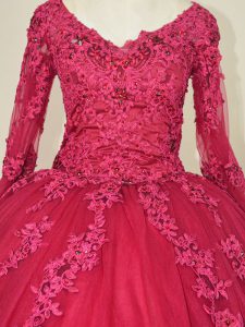 Long Sleeves Tulle Floor Length Lace Up Quinceanera Dresses in Red with Lace and Appliques