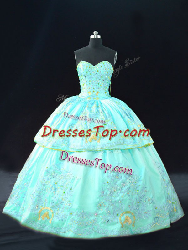 Lovely Aqua Blue Satin Lace Up Sweetheart Sleeveless Floor Length Ball Gown Prom Dress Embroidery