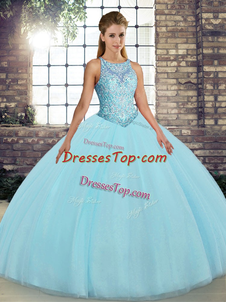 Lovely Aqua Blue Tulle Lace Up Vestidos de Quinceanera Sleeveless Floor Length Embroidery