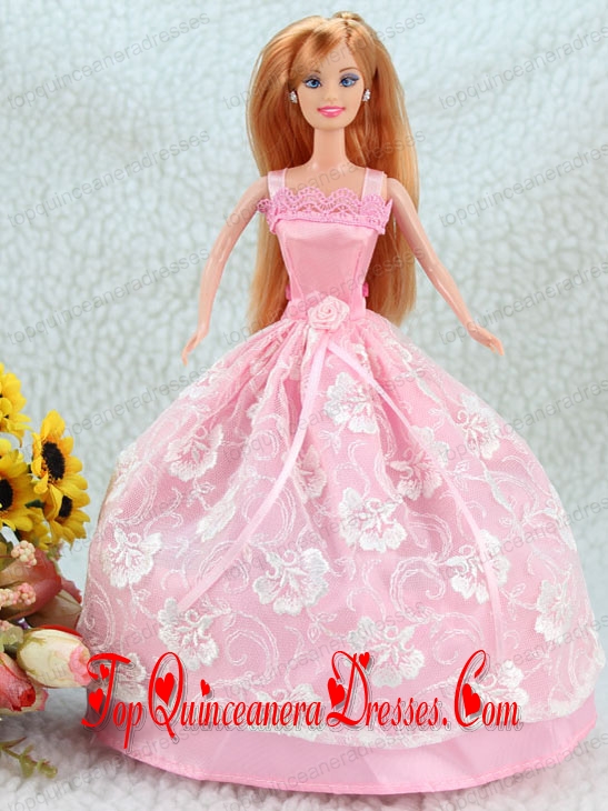 Lovely Baby Pink Ball Gown Straps With Sash and Lace Party Clothes Fashion Dress For Noble Barbie