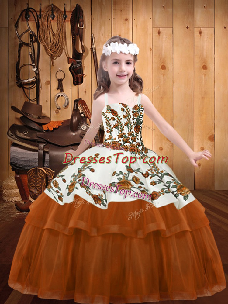 Lovely Ball Gowns Little Girls Pageant Gowns Rust Red Straps Organza Sleeveless Floor Length Lace Up