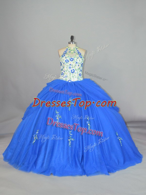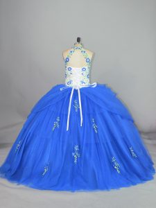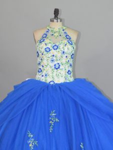 Lovely Blue Ball Gowns Tulle Strapless Sleeveless Appliques and Embroidery Floor Length Lace Up 15 Quinceanera Dress