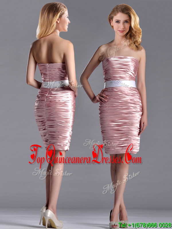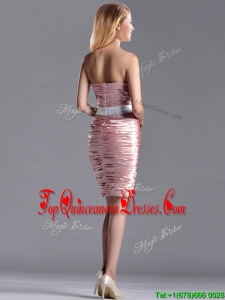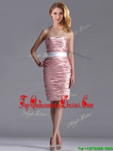 Lovely Column Peach Dama Dress with Ruching and White Belt