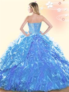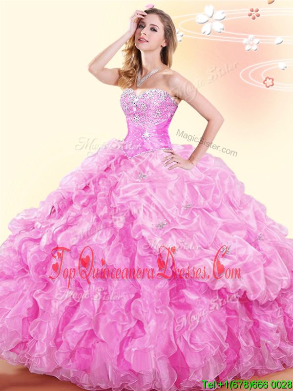 Lovely Floor Length Rose Pink Sweet 16 Quinceanera Dress Organza Sleeveless Beading and Ruffles and Pick Ups