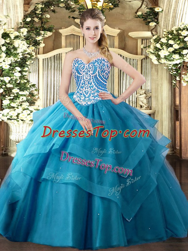 Lovely Floor Length Teal Quinceanera Gowns Tulle Sleeveless Beading and Ruffled Layers