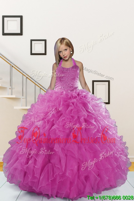 Lovely Halter Top Pink Sleeveless Floor Length Beading and Ruffles Lace Up Evening Gowns