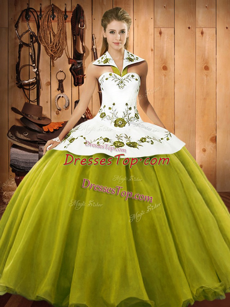 Lovely Olive Green Sleeveless Floor Length Embroidery Lace Up Quince Ball Gowns