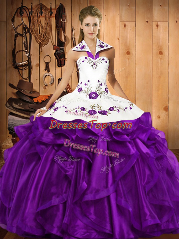 Lovely Purple Lace Up Halter Top Embroidery and Ruffles 15 Quinceanera Dress Organza Sleeveless