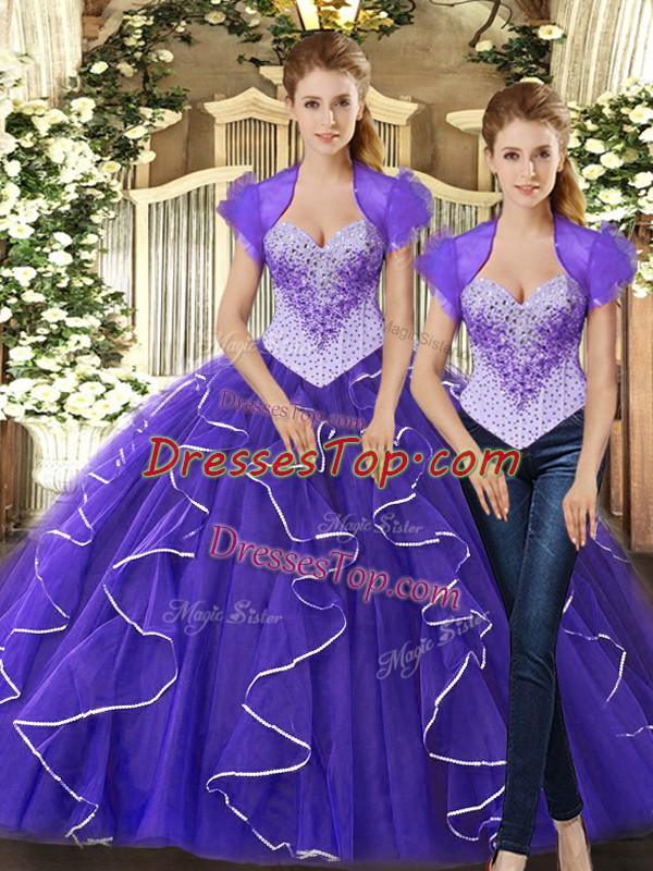 Lovely Purple Sleeveless Floor Length Beading and Ruffles Lace Up Vestidos de Quinceanera