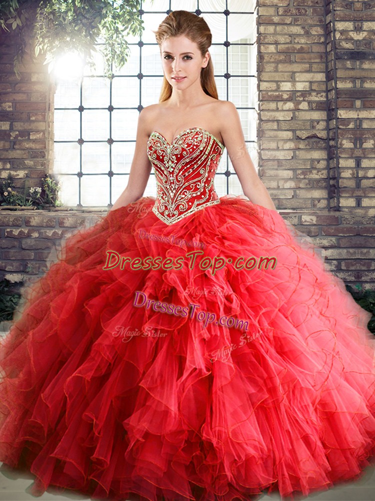 Lovely Red Sweetheart Neckline Beading and Ruffles Quinceanera Gowns Sleeveless Lace Up