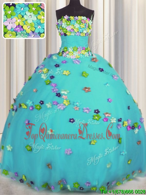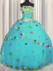 Lovely Strapless Sleeveless Vestidos de Damas Floor Length Hand Made Flower Aqua Blue Tulle
