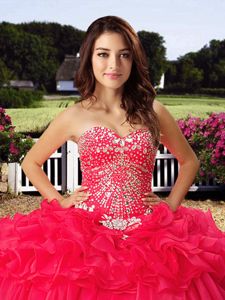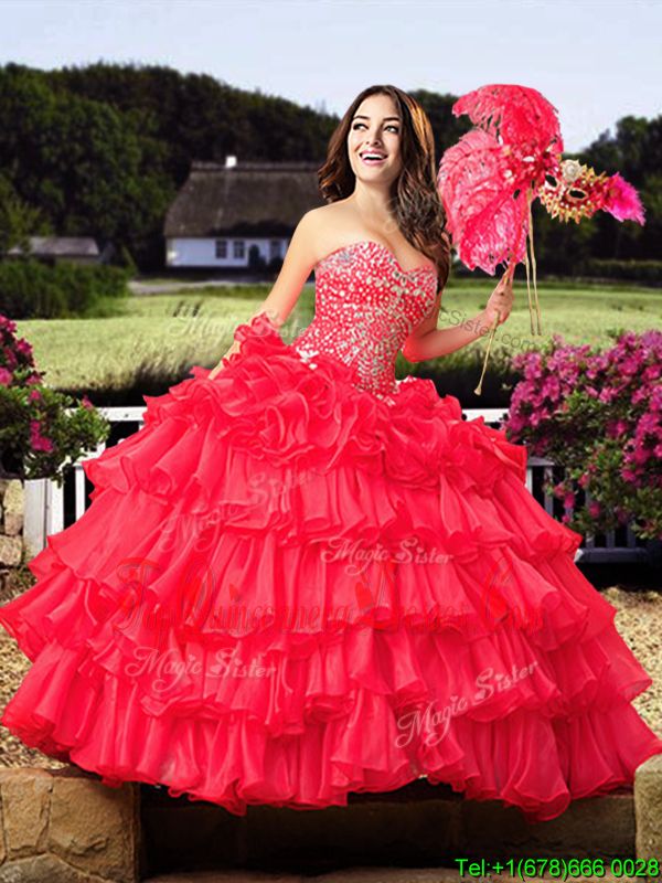Lovely Sweetheart Sleeveless 15th Birthday Dress Floor Length Beading and Ruffled Layers Coral Red Organza
