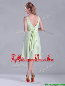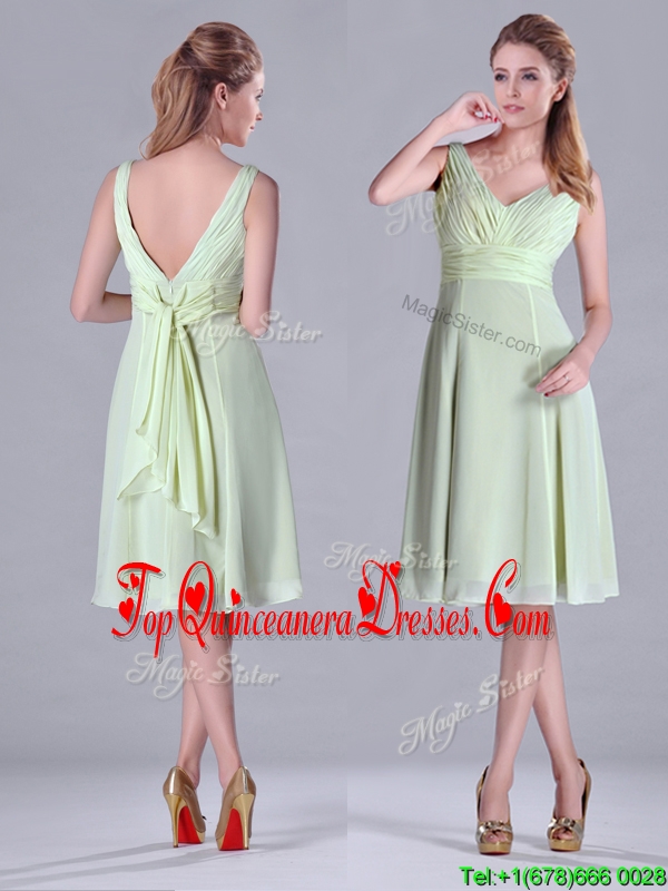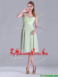 Lovely Tea Length Ruched and Belted Dama Dress in Yellow Green