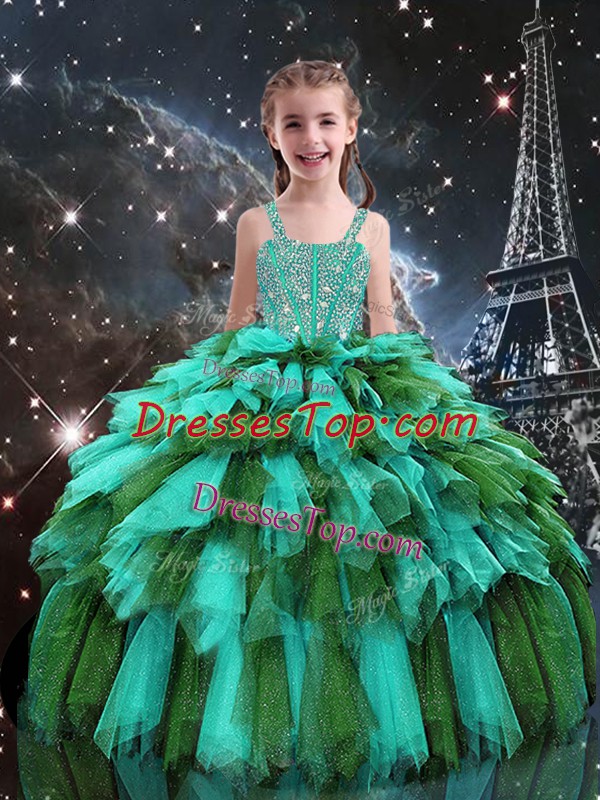 Lovely Turquoise Tulle Lace Up Straps Sleeveless Floor Length Pageant Dress for Teens Beading and Ruffles