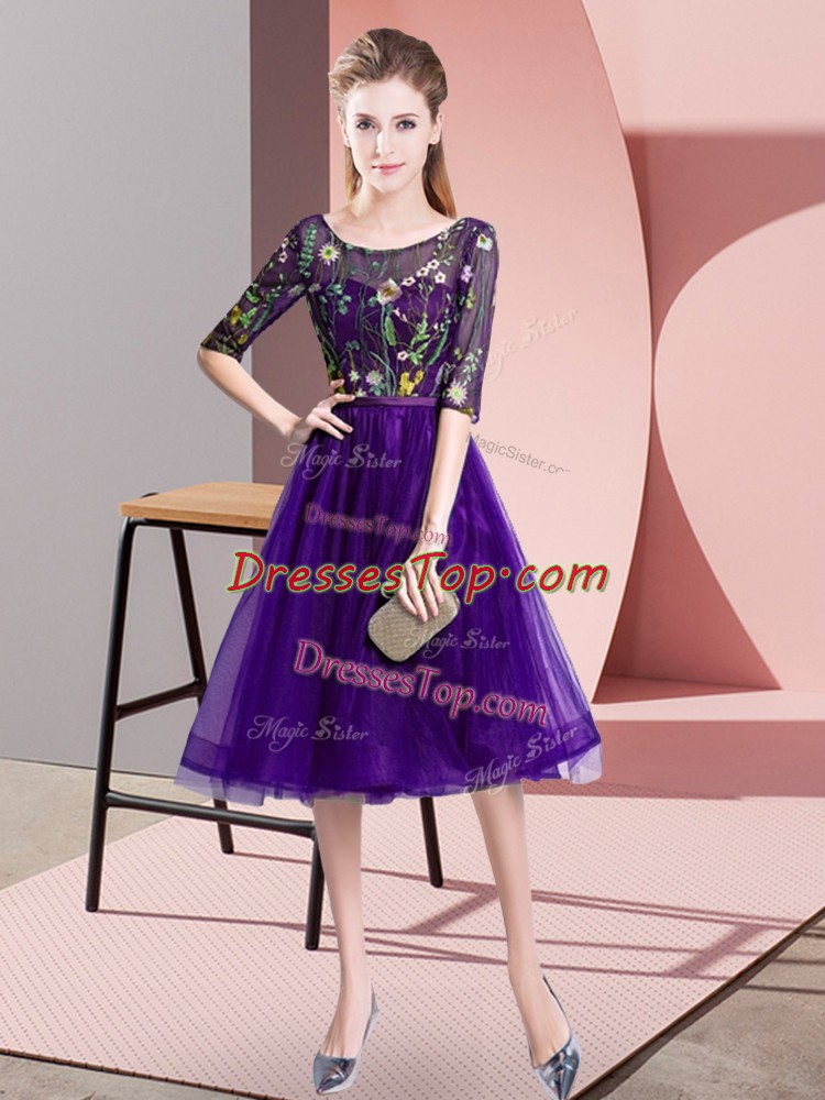 Low Price Empire Dama Dress Purple Scoop Tulle Half Sleeves Knee Length Lace Up