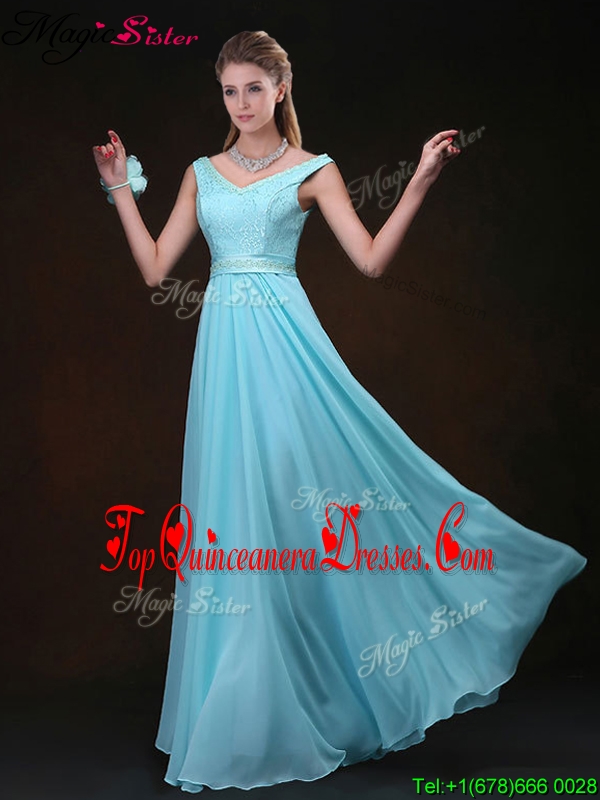 Low price Empire V Neck Gorgeous Dama Dresses with Belt and Lace