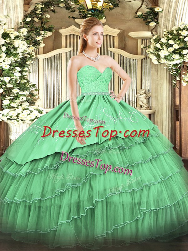 Low Price Green Sleeveless Floor Length Beading and Lace and Embroidery and Ruffled Layers Zipper Vestidos de Quinceanera