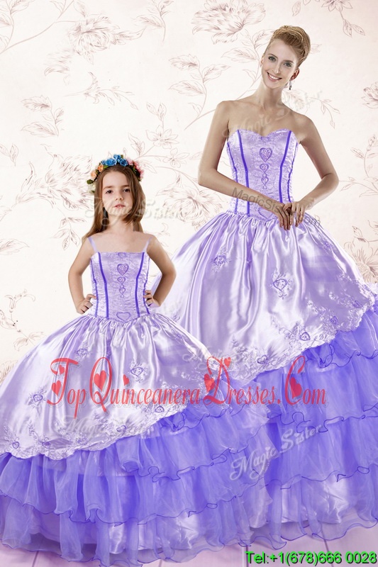 Low Price Lavender Ball Gowns Embroidery and Ruffled Layers Quinceanera Gown Lace Up Organza Sleeveless Floor Length