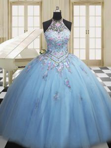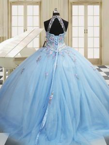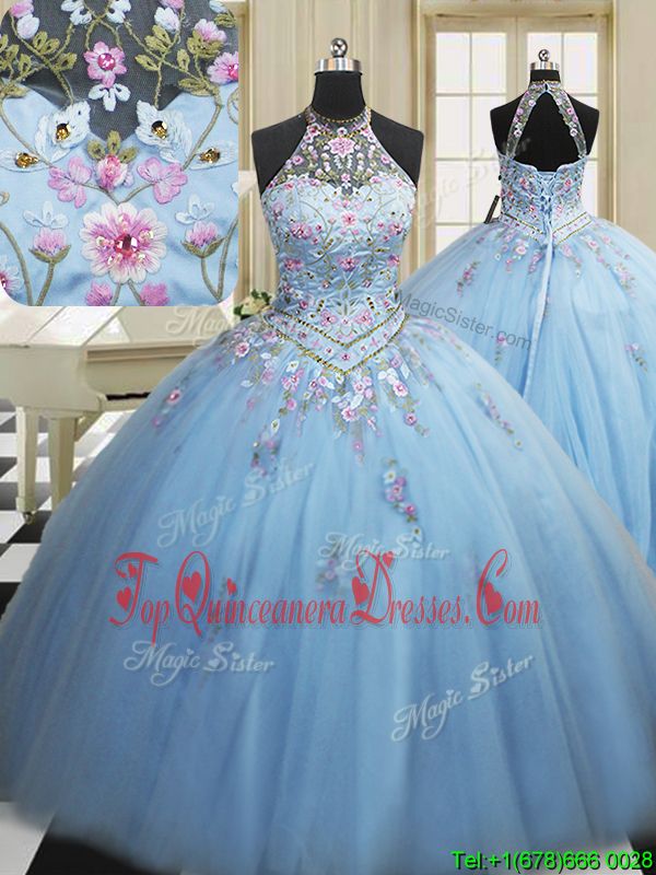 Low Price Light Blue Lace Up High-neck Embroidery Quinceanera Dress Tulle Sleeveless