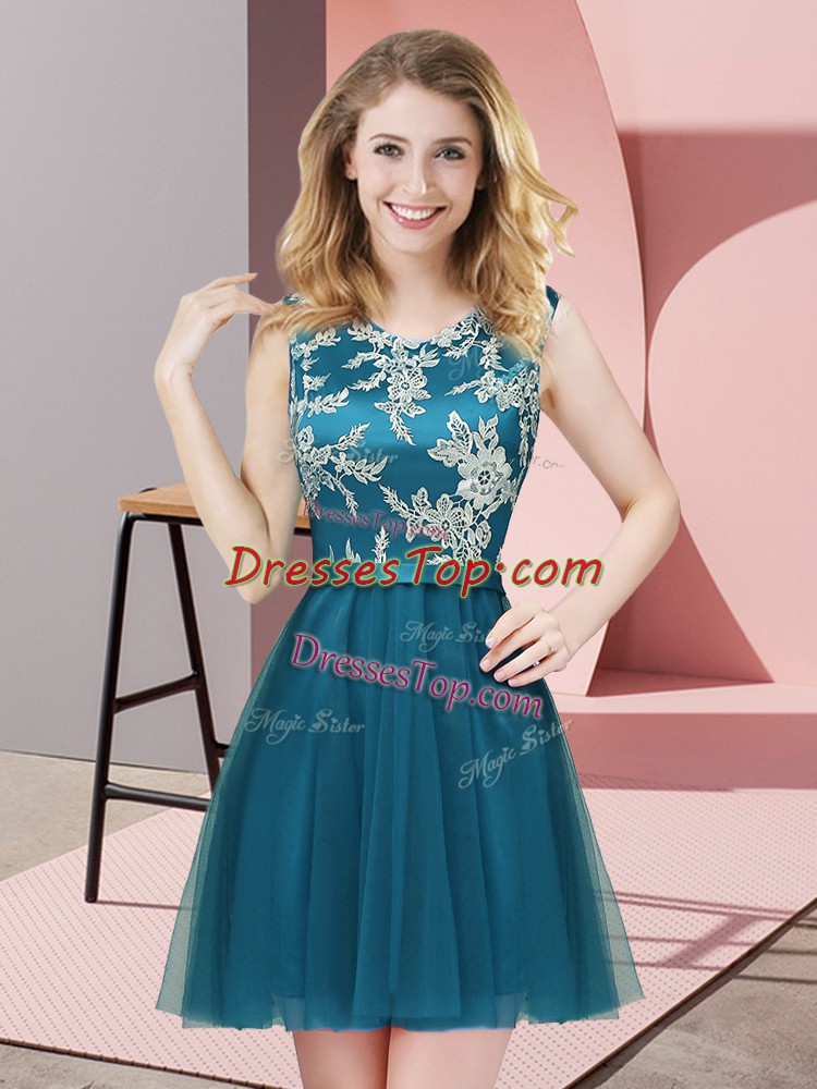 Low Price Teal A-line Tulle Scoop Sleeveless Lace Mini Length Side Zipper Quinceanera Dama Dress