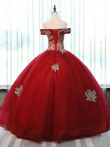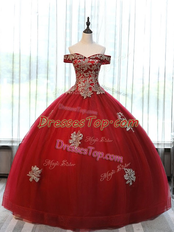 Low Price Wine Red Tulle Lace Up Off The Shoulder Sleeveless Floor Length Sweet 16 Dress Beading and Appliques