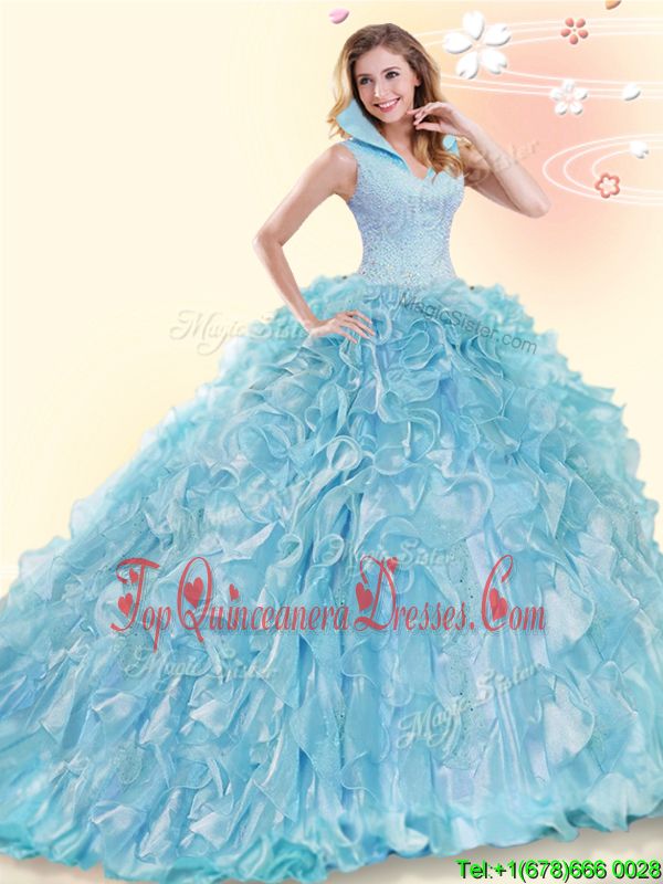 Luxurious Ball Gowns Sleeveless Aqua Blue Vestidos de Damas Brush Train Backless