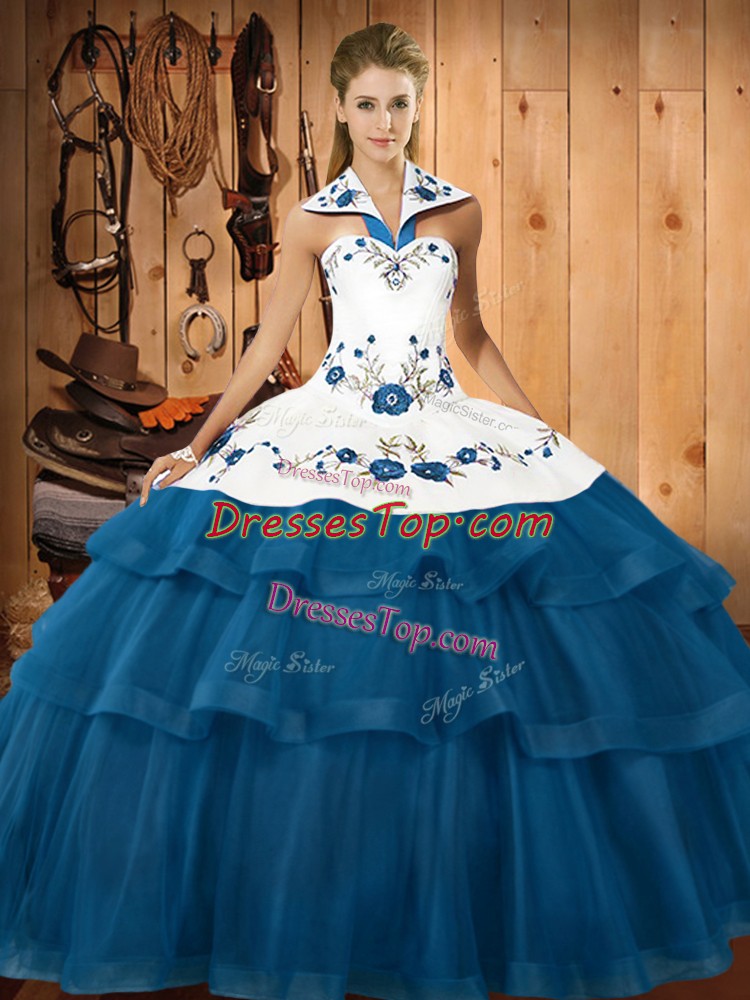 Luxurious Blue Halter Top Lace Up Embroidery and Ruffled Layers Vestidos de Quinceanera Sweep Train Sleeveless
