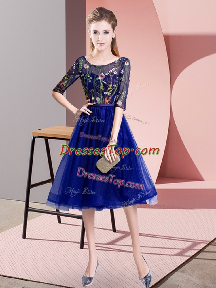 Luxurious Blue Scoop Lace Up Embroidery Dama Dress for Quinceanera Half Sleeves