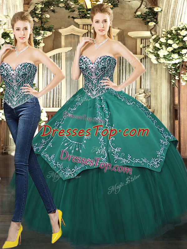 Luxurious Dark Green Ball Gowns Tulle Sweetheart Sleeveless Beading and Appliques Floor Length Lace Up Quinceanera Gowns
