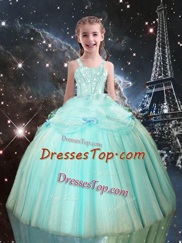 Luxurious Floor Length Aqua Blue Little Girls Pageant Dress Wholesale Tulle Sleeveless Beading