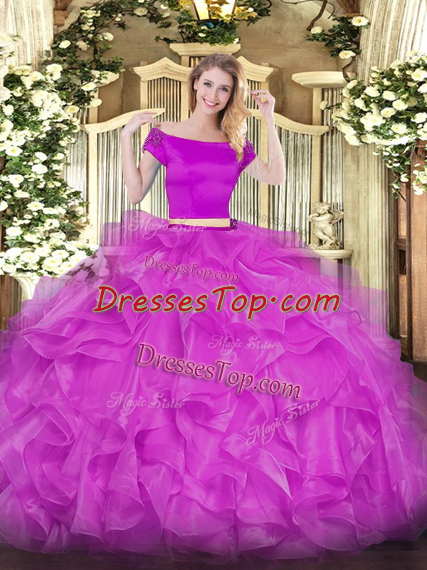 Luxurious Fuchsia Short Sleeves Appliques and Ruffles Floor Length 15th Birthday Dress